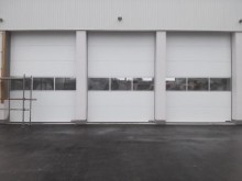 Industrijska sekcijska vrata, L-žlijeb, površina MICROGRAIN RAL 9016, bijela boja, tip: SPU F42, NF okvir 3350x750, plastično Duratec staklo 26mm.